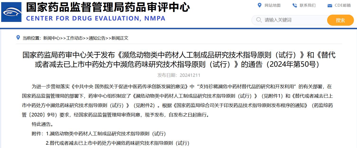 國家藥監(jiān)局藥審中心關(guān)于發(fā)布《瀕危動物類中藥材人工制成品研究技術(shù)指導(dǎo)原則(試行)》和《替代或者減去已上市中藥處方中瀕危藥味研究技術(shù)指導(dǎo)原則(試行)》的通告(2024年第50號)