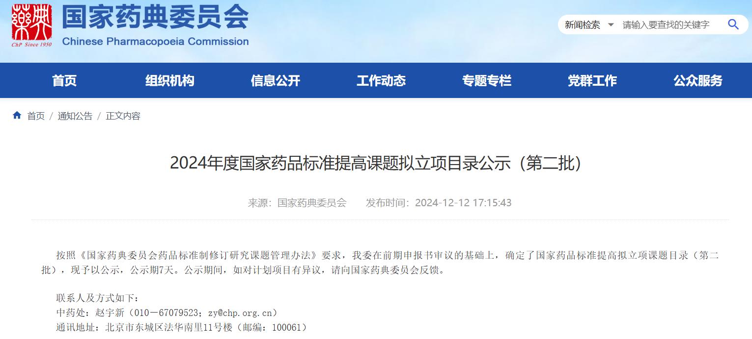 2024年度國家藥品標準提高課題擬立項目錄公示(第二批)