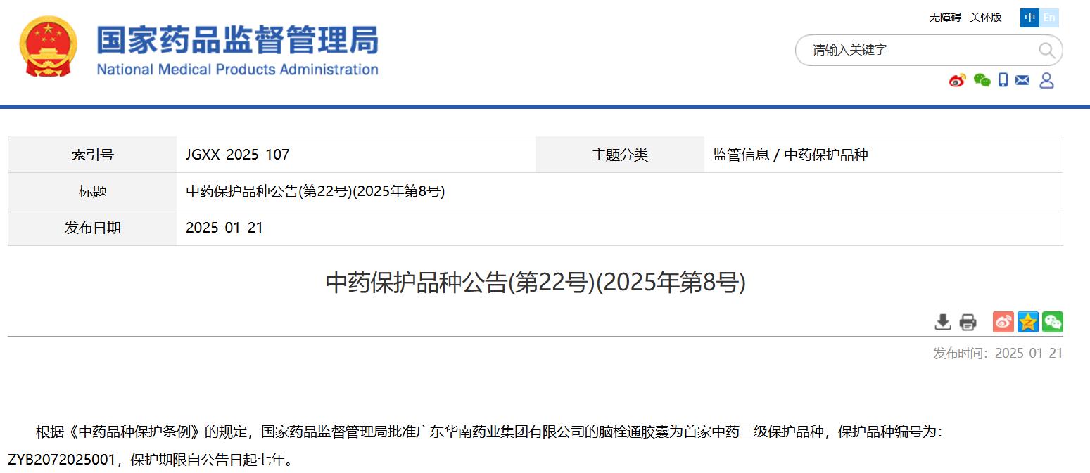 中藥保護(hù)品種公告(第22號)(2025年第8號)