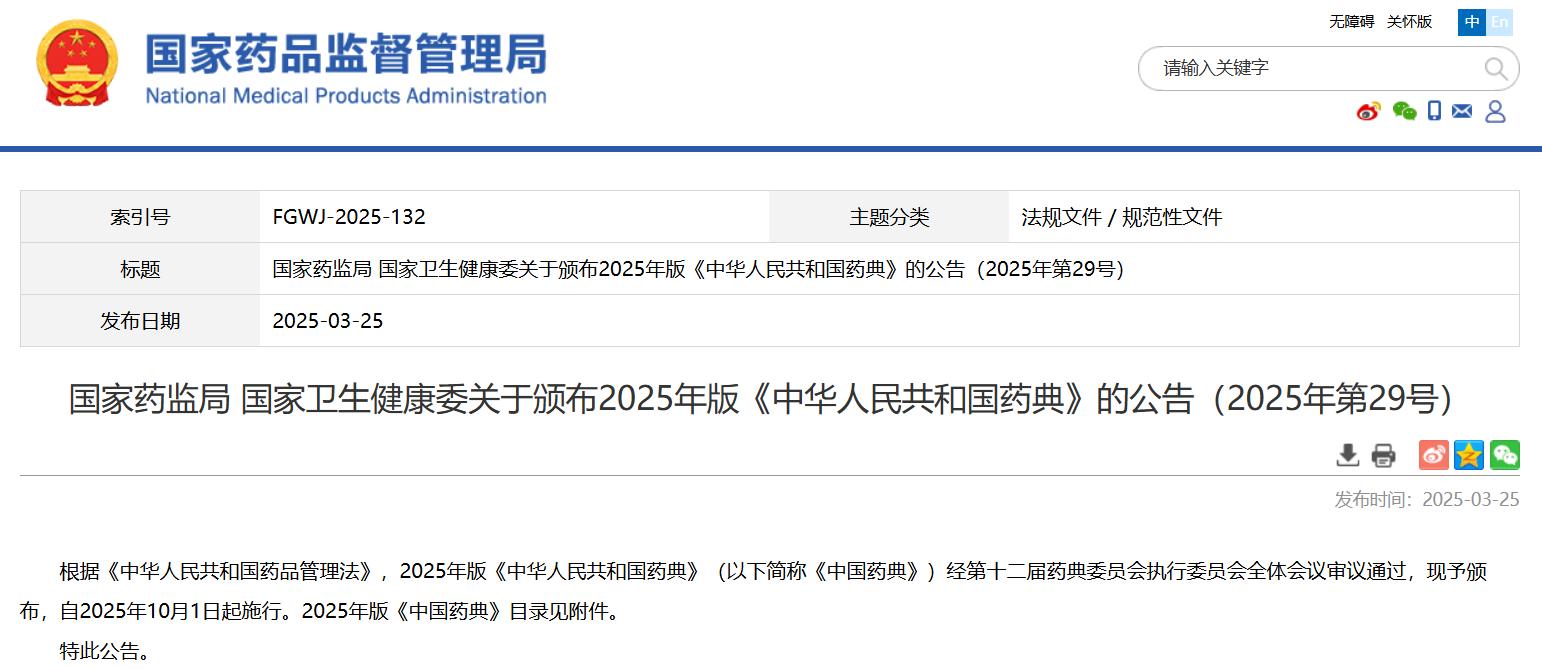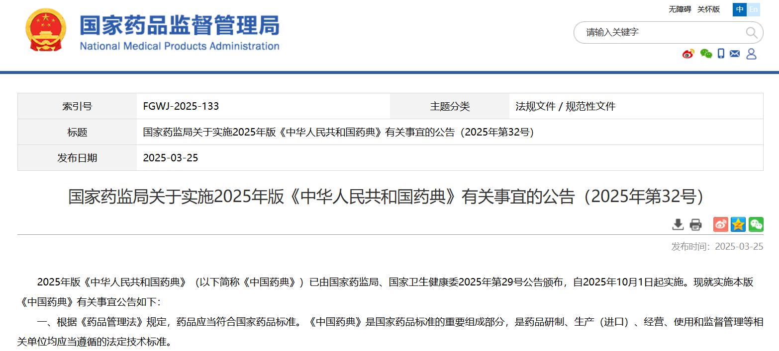 國家藥監(jiān)局關(guān)于實(shí)施2025年版《中華人民共和國藥典》有關(guān)事宜的公告(2025年第32號)