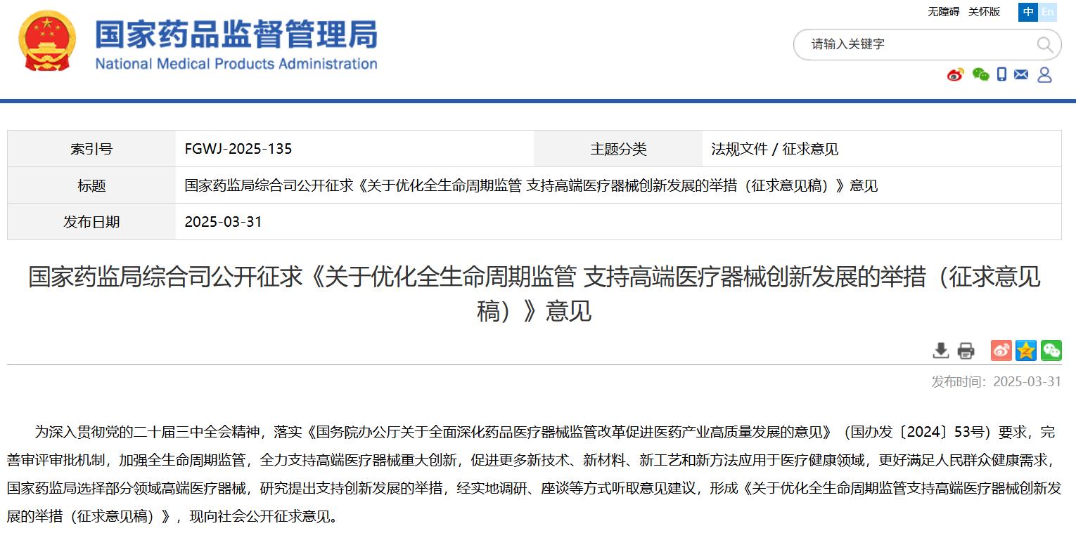 國(guó)家藥監(jiān)局綜合司公開(kāi)征求《關(guān)于優(yōu)化全生命周期監(jiān)管 支持高端醫(yī)療器械創(chuàng)新發(fā)展的舉措(征求意見(jiàn)稿)》意見(jiàn)