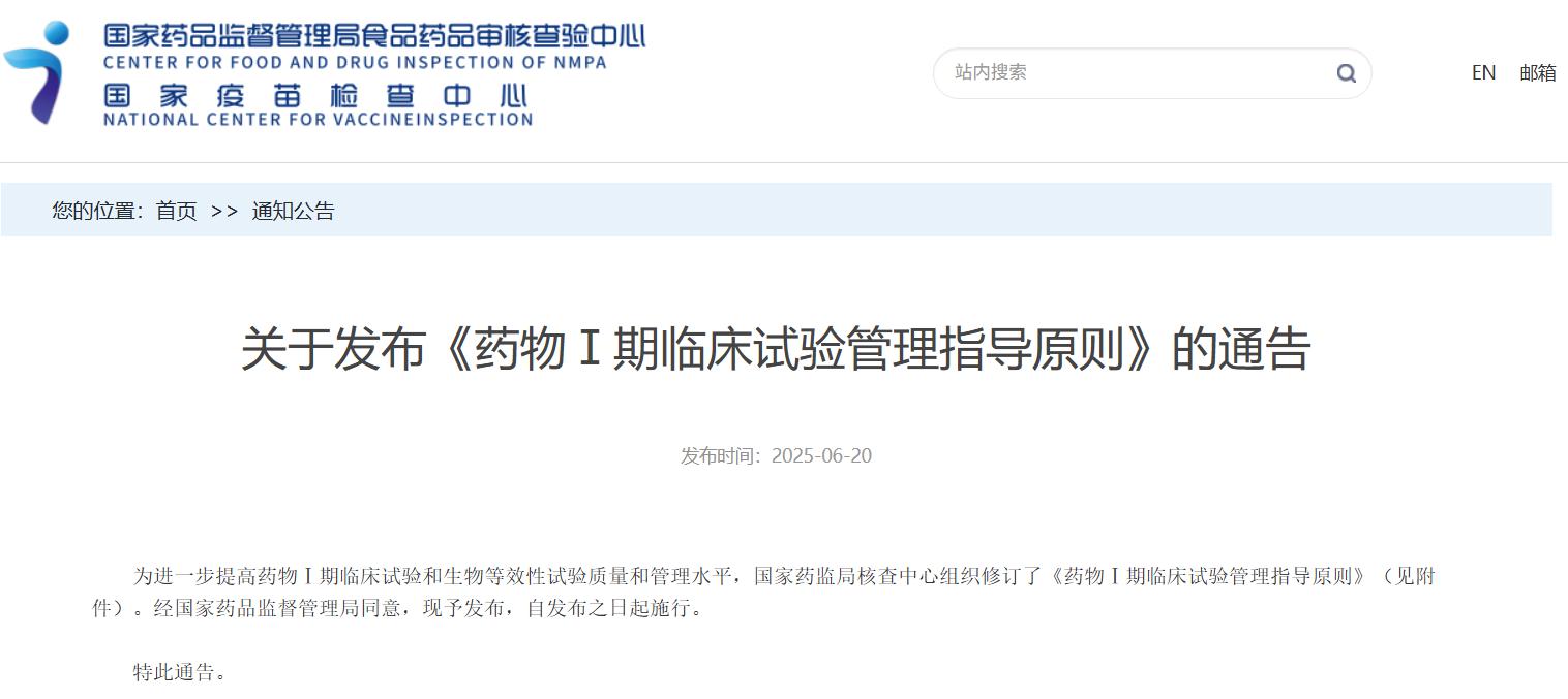 國家藥品監(jiān)督管理局食品藥品審核查驗中心關于發(fā)布《藥物Ⅰ期臨床試驗管理指導原則》的通告