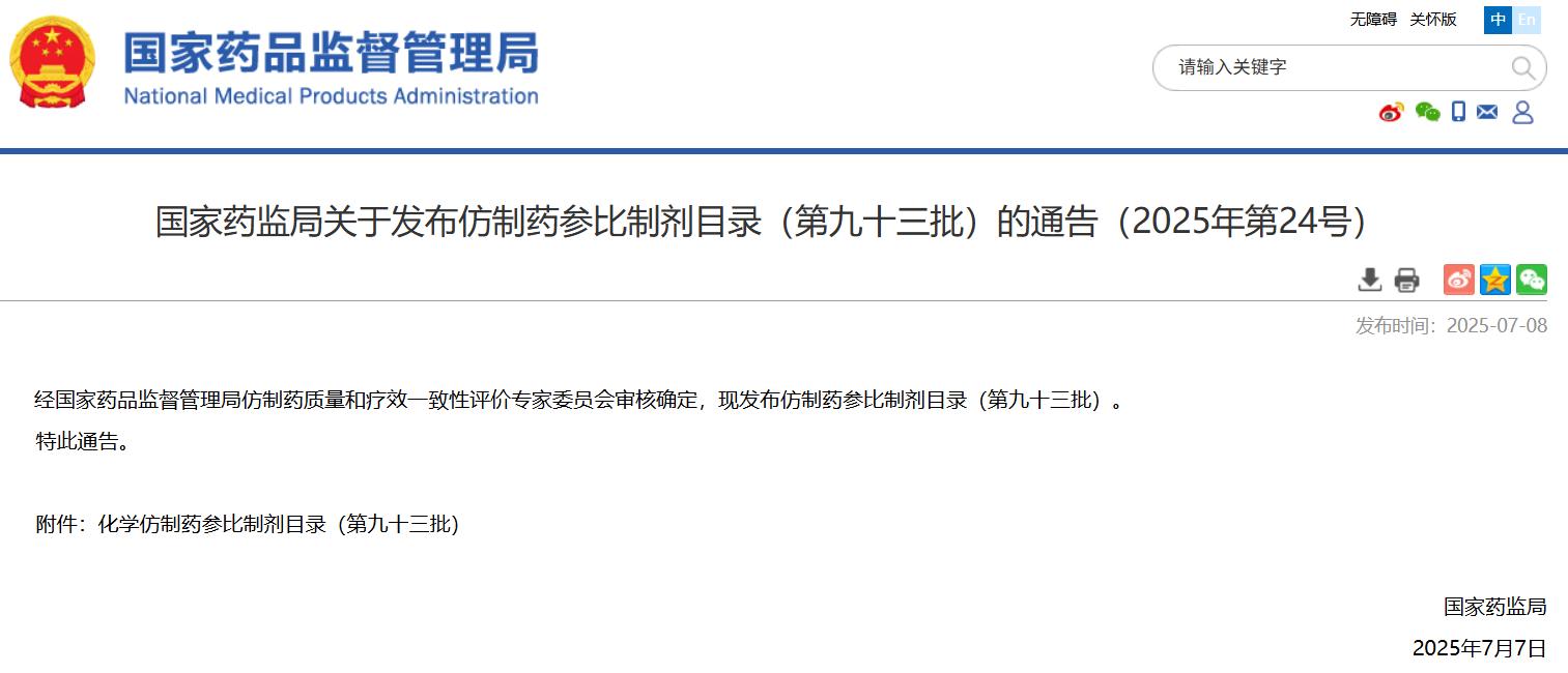 國家藥監(jiān)局關(guān)于發(fā)布仿制藥參比制劑目錄(第九十三批)的通告(2025年第24號(hào))
