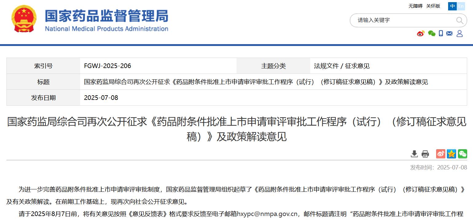 國家藥監(jiān)局綜合司再次公開征求《藥品附條件批準(zhǔn)上市申請(qǐng)審評(píng)審批工作程序(試行)(修訂稿征求意見稿)》及政策解讀意見