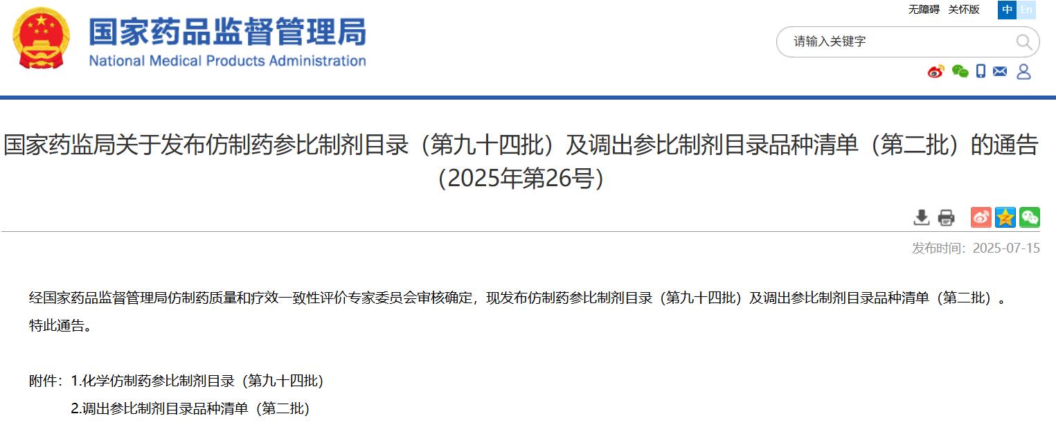 國家藥監(jiān)局關(guān)于發(fā)布仿制藥參比制劑目錄(第九十四批)及調(diào)出參比制劑目錄品種清單(第二批)的通告(2025年第26號)