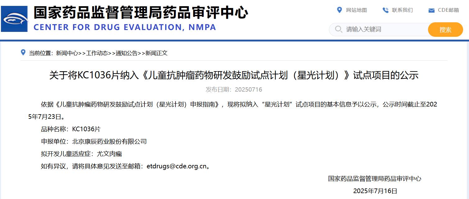 關(guān)于將KC1036片納入《兒童抗腫瘤藥物研發(fā)鼓勵試點(diǎn)計劃(星光計劃)》試點(diǎn)項目的公示