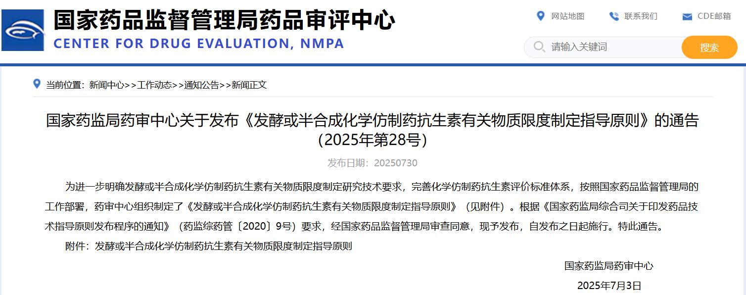 國(guó)家藥監(jiān)局藥審中心關(guān)于發(fā)布《發(fā)酵或半合成化學(xué)仿制藥抗生素有關(guān)物質(zhì)限度制定指導(dǎo)原則》的通告(2025年第28號(hào))