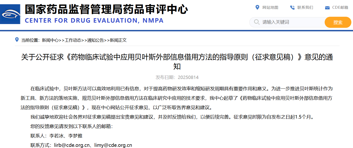 關(guān)于公開(kāi)征求《藥物臨床試驗(yàn)中應(yīng)用貝葉斯外部信息借用方法的指導(dǎo)原則(征求意見(jiàn)稿)》意見(jiàn)的通知