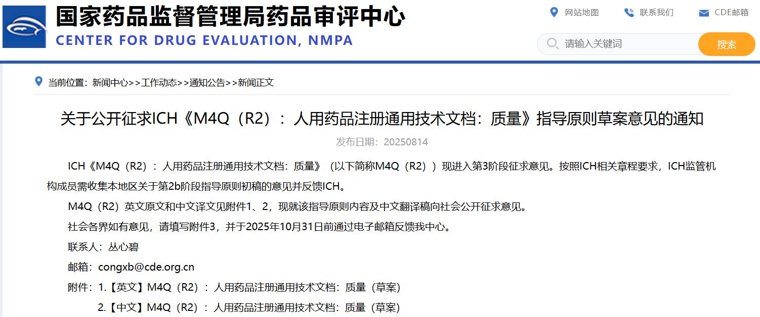關(guān)于公開(kāi)征求ICH《M4Q(R2):人用藥品注冊(cè)通用技術(shù)文檔:質(zhì)量》指導(dǎo)原則草案意見(jiàn)的通知