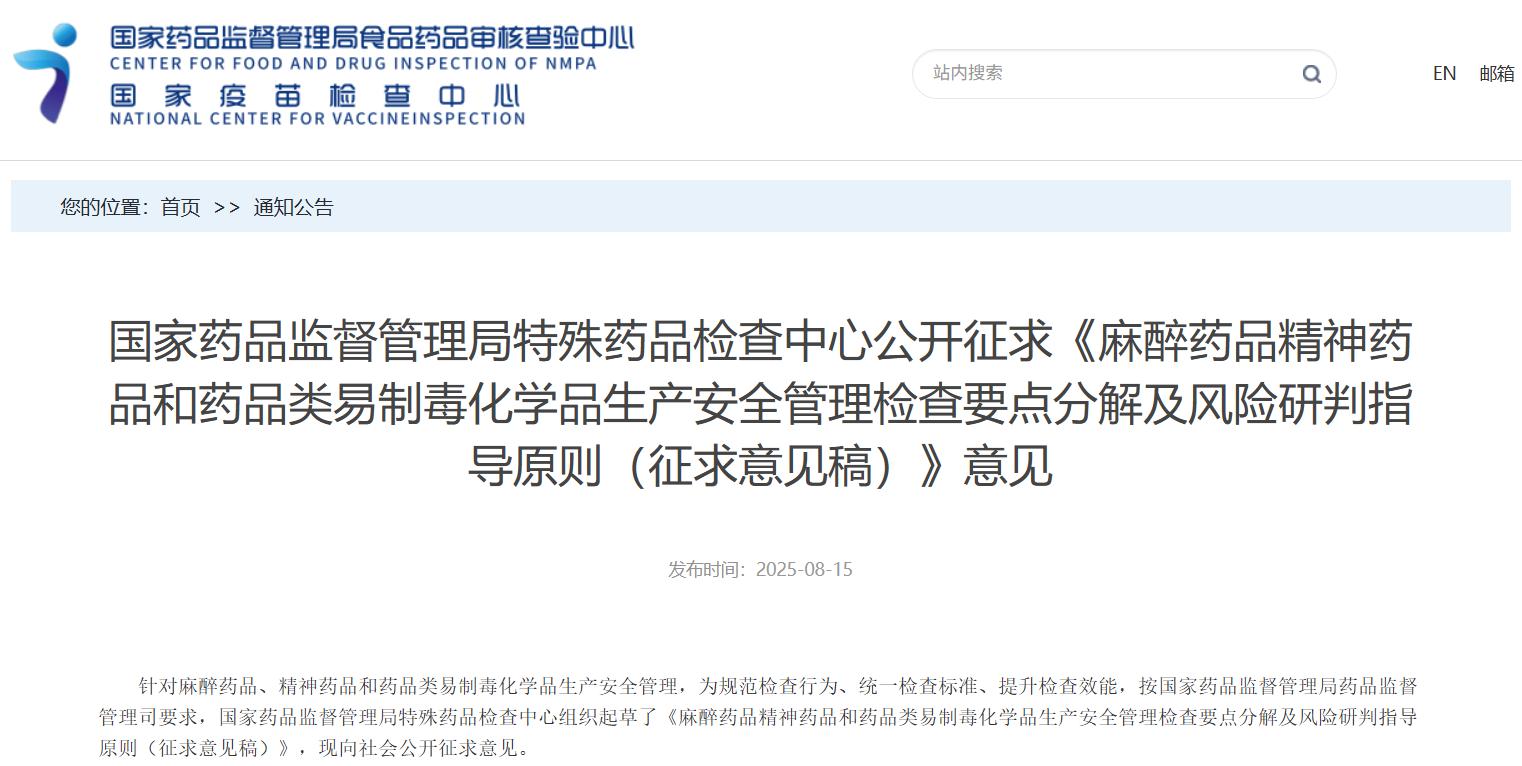 國(guó)家藥品監(jiān)督管理局特殊藥品檢查中心公開(kāi)征求《麻醉藥品精神藥品和藥品類(lèi)易制毒化學(xué)品生產(chǎn)安全管理檢查要點(diǎn)分解及風(fēng)險(xiǎn)研判指導(dǎo)原則(征求意見(jiàn)稿)》意見(jiàn)