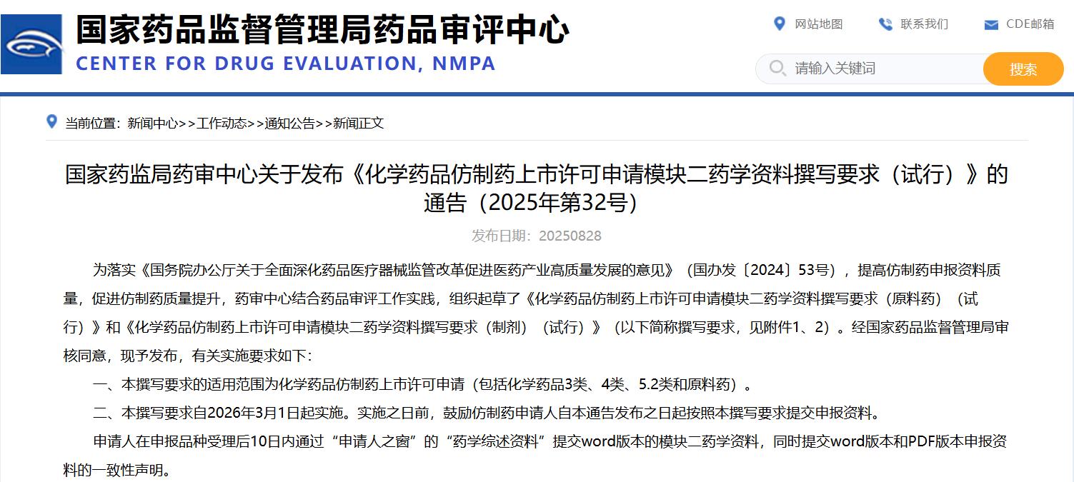 國家藥監(jiān)局藥審中心關(guān)于發(fā)布《化學(xué)藥品仿制藥上市許可申請模塊二藥學(xué)資料撰寫要求(試行)》的通告(2025年第32號)
