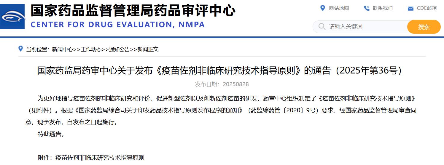 國家藥監(jiān)局藥審中心關(guān)于發(fā)布《疫苗佐劑非臨床研究技術(shù)指導(dǎo)原則》的通告(2025年第36號)