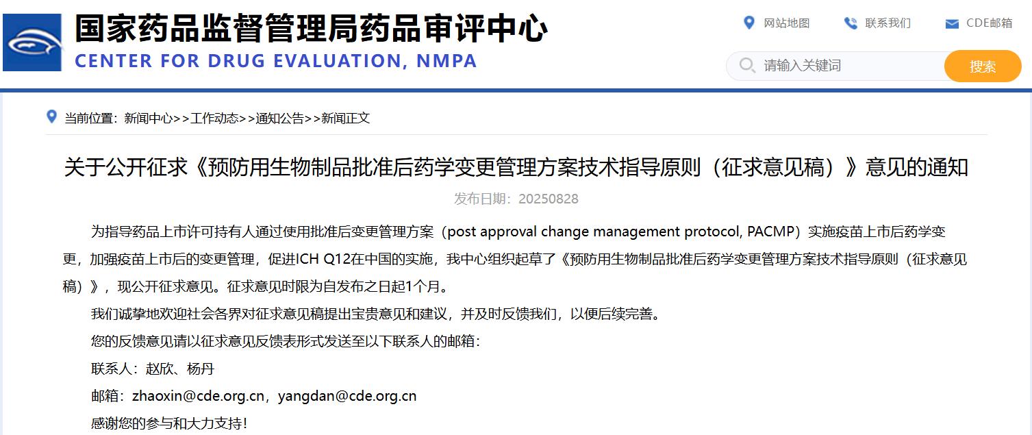 關(guān)于公開征求《預(yù)防用生物制品批準后藥學(xué)變更管理方案技術(shù)指導(dǎo)原則(征求意見稿)》意見的通知