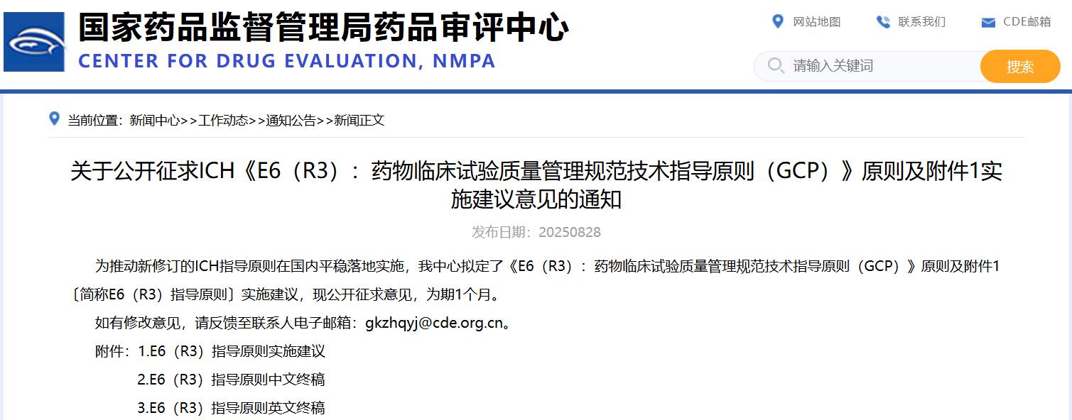 關(guān)于公開征求ICH《E6(R3):藥物臨床試驗質(zhì)量管理規(guī)范技術(shù)指導(dǎo)原則(GCP)》原則及附件1實施建議意見的通知