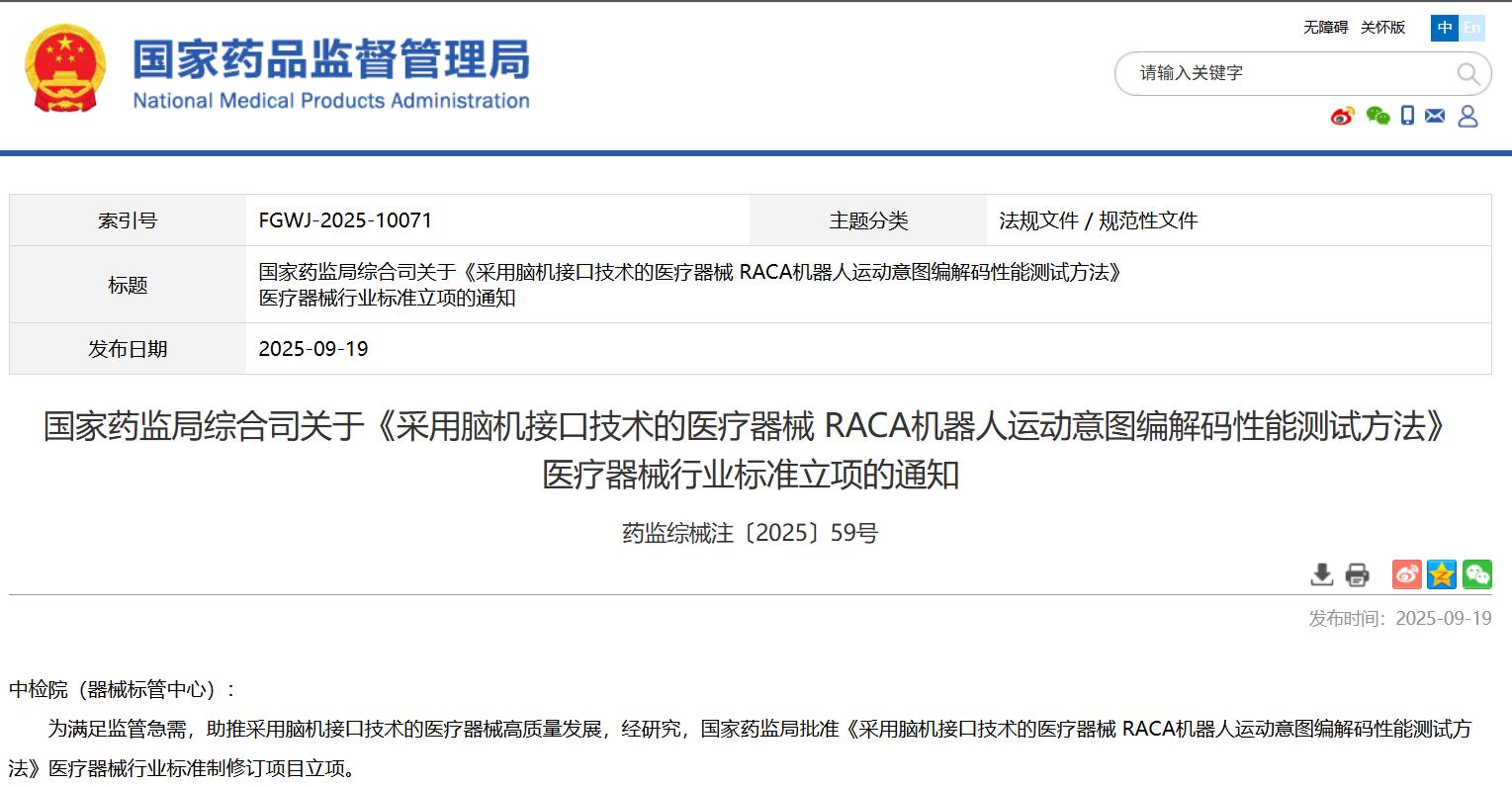 國家藥監(jiān)局綜合司關(guān)于《采用腦機(jī)接口技術(shù)的醫(yī)療器械 RACA機(jī)器人運(yùn)動意圖編解碼性能測試方法》醫(yī)療器械行業(yè)標(biāo)準(zhǔn)立項的通知
