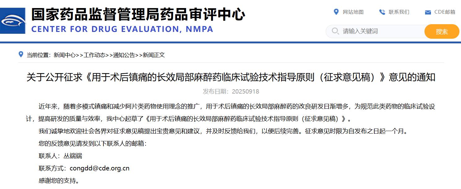 關(guān)于公開征求《用于術(shù)后鎮(zhèn)痛的長效局部麻醉藥臨床試驗技術(shù)指導(dǎo)原則(征求意見稿)》意見的通知