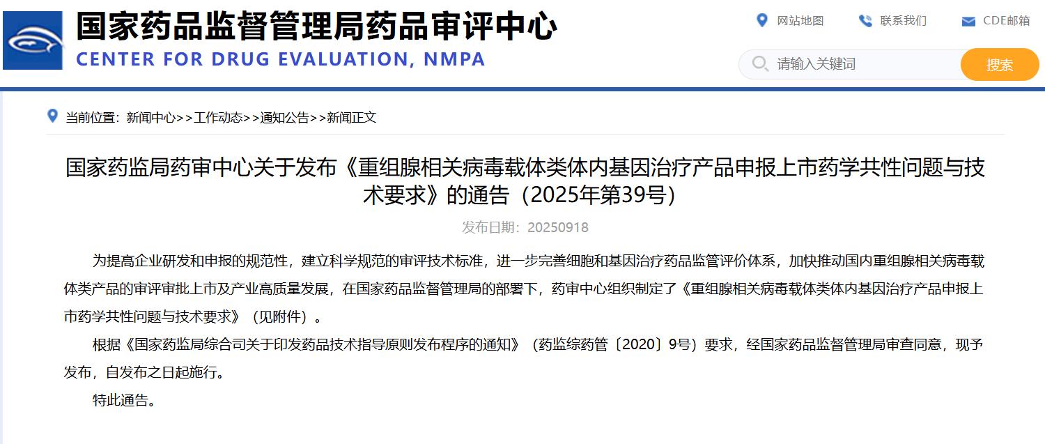 國家藥監(jiān)局藥審中心關(guān)于發(fā)布《重組腺相關(guān)病毒載體類體內(nèi)基因治療產(chǎn)品申報上市藥學(xué)共性問題與技術(shù)要求》的通告(2025年第39號)