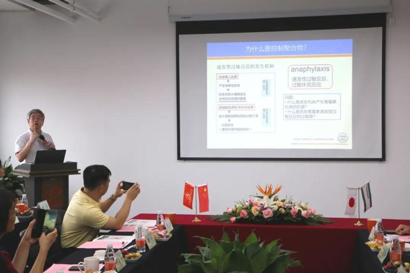 啟動(dòng)儀式上,課題組專家胡昌勤老師作《抗生素聚合物研發(fā)現(xiàn)狀及展望》主題演講,胡老師首先向大家介紹了抗生素近100年的發(fā)展研究歷史,深入解讀了頭孢類抗生素藥物引起過(guò)敏反應(yīng)的機(jī)理及頭孢菌素聚合反應(yīng)特性與聚合物結(jié)構(gòu),并對(duì)β-內(nèi)酰胺類抗生素聚合物雜質(zhì)控制策略的形成和發(fā)展做了詳細(xì)分析,干貨十足,在場(chǎng)嘉賓競(jìng)相拍照留存。