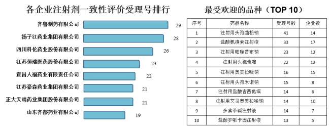 從各企業(yè)注射劑一致性評(píng)價(jià)受理號(hào)排行(圖1)及最受歡迎的注射劑品種可以看出,齊魯制藥、揚(yáng)子江、四川科倫、江蘇恒瑞、宜昌人福、江蘇豪森以及正大天晴注射劑的受理號(hào)均超過了20個(gè)。另外,在最受歡迎TOP10名單中,以抗炎抗感染類大容量品種最受大家青睞,競(jìng)爭(zhēng)激烈。