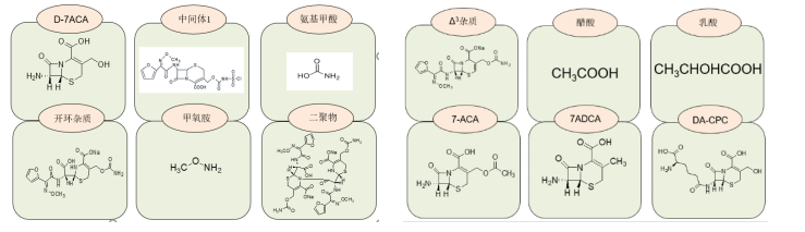 我們根據(jù)原料藥的生產(chǎn)工藝及β-內(nèi)酰胺類抗生素的特點(diǎn),重點(diǎn)研究了以下雜質(zhì):