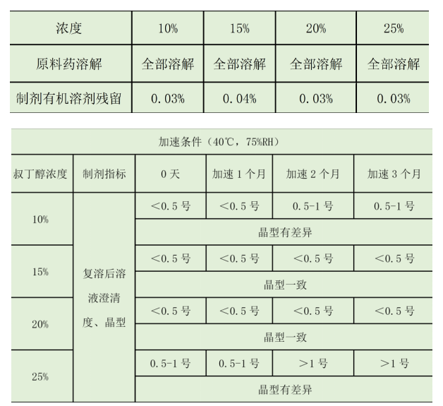結(jié)論:試驗(yàn)結(jié)果表明,輔料叔丁醇的濃度對(duì)制劑的有機(jī)溶劑殘留沒有明顯影響,但是對(duì)溶液的澄清度和復(fù)溶后原料的晶型有較為明顯的影響。最終確定15%和20%的輔料濃度是比較合適的。