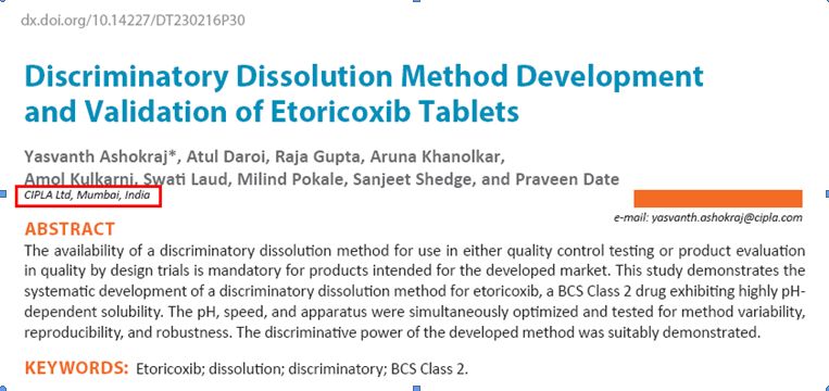 2016年,印度同仁對(duì)溶出度技術(shù)的運(yùn)用已日趨成熟,開始公開撰文。《溶出度試驗(yàn)技術(shù)雜志(DissolutionTechnologies)》在該年5月發(fā)表了一篇由印度CIPLA公司研發(fā)人員撰寫的“以依托考昔片為例:如何開發(fā)適度區(qū)分力的溶出方法”文章。
