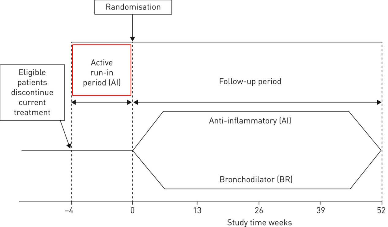 ▲ 比較抗炎藥(AI)與支氣管擴(kuò)張劑(BR)有效性的隨機(jī)對(duì)照試驗(yàn),試驗(yàn)藥物治療之前受試者先進(jìn)入為其4周的導(dǎo)入期