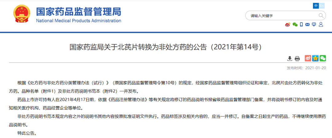 關(guān)于北芪片轉(zhuǎn)換為非處方藥的公告(2021年第14號)