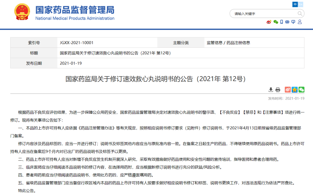 關(guān)于修訂速效救心丸說明書的公告(2021年 第12號)