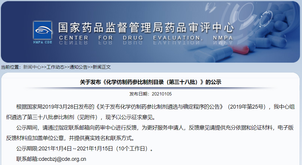 關(guān)于發(fā)布《化學(xué)仿制藥參比制劑目錄(第三十八批)》的公示