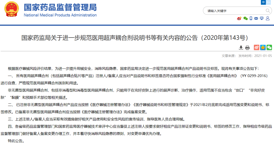關(guān)于進(jìn)一步規(guī)范醫(yī)用超聲耦合劑說明書等有關(guān)內(nèi)容的公告(2020年第143號(hào))