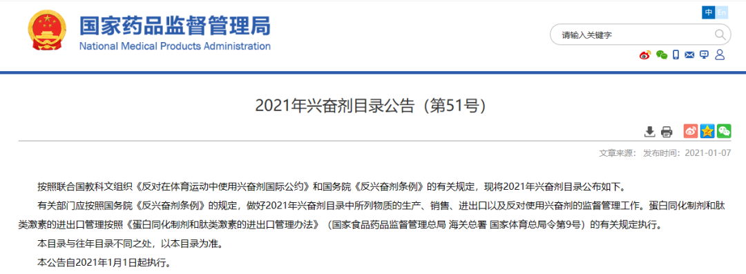 有關(guān)部門應(yīng)按照國(guó)務(wù)院《反興奮劑條例》的規(guī)定,做好2021年興奮劑目錄中所列物質(zhì)的生產(chǎn)、銷售、進(jìn)出口以及反對(duì)使用興奮劑的監(jiān)督管理工作。蛋白同化制劑和肽類激素的進(jìn)出口管理按照《蛋白同化制劑和肽類激素的進(jìn)出口管理辦法》(國(guó)家食品藥品監(jiān)督管理總局 海關(guān)總署 國(guó)家體育總局令第9號(hào))的有關(guān)規(guī)定執(zhí)行。