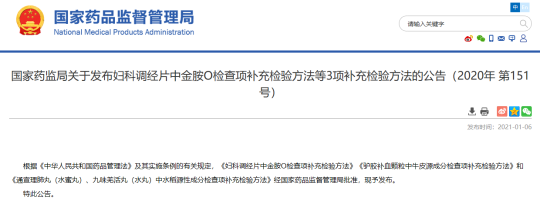 關(guān)于發(fā)布婦科調(diào)經(jīng)片中金胺O檢查項(xiàng)補(bǔ)充檢驗(yàn)方法等3項(xiàng)補(bǔ)充檢驗(yàn)方法的公告(2020年 第151號(hào))