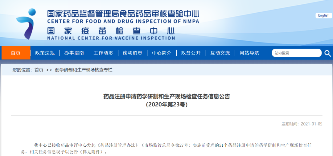 藥品注冊(cè)申請(qǐng)藥學(xué)研制和生產(chǎn)現(xiàn)場(chǎng)檢查任務(wù)信息公告 (2020年第23號(hào))
