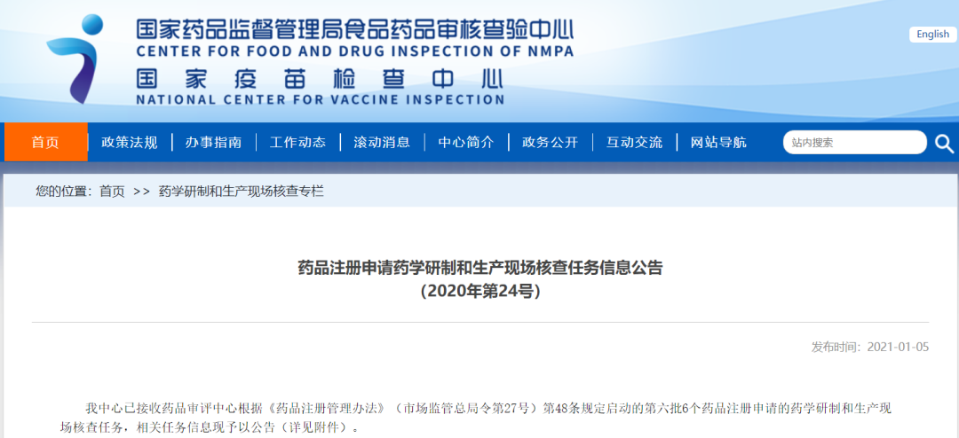 藥品注冊(cè)申請(qǐng)藥學(xué)研制和生產(chǎn)現(xiàn)場(chǎng)核查任務(wù)信息公告 (2020年第24號(hào))