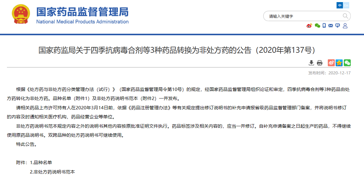關(guān)于四季抗病毒合劑等3種藥品轉(zhuǎn)換為非處方藥的公告(2020年第137號(hào))