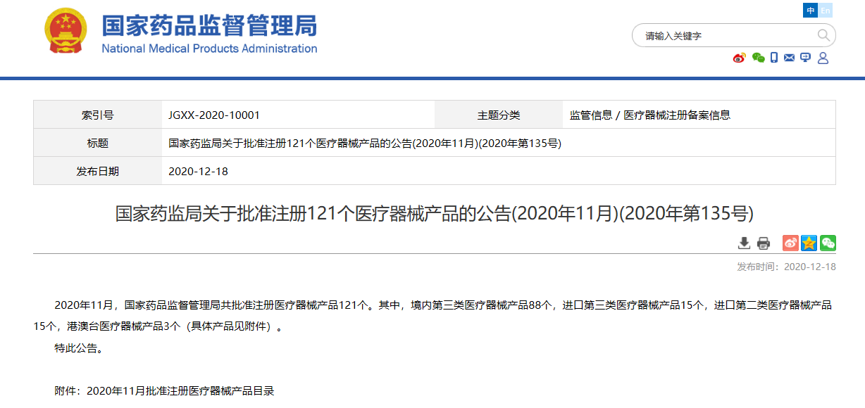 關(guān)于批準(zhǔn)注冊(cè)121個(gè)醫(yī)療器械產(chǎn)品的公告(2020年11月)(2020年第135號(hào))