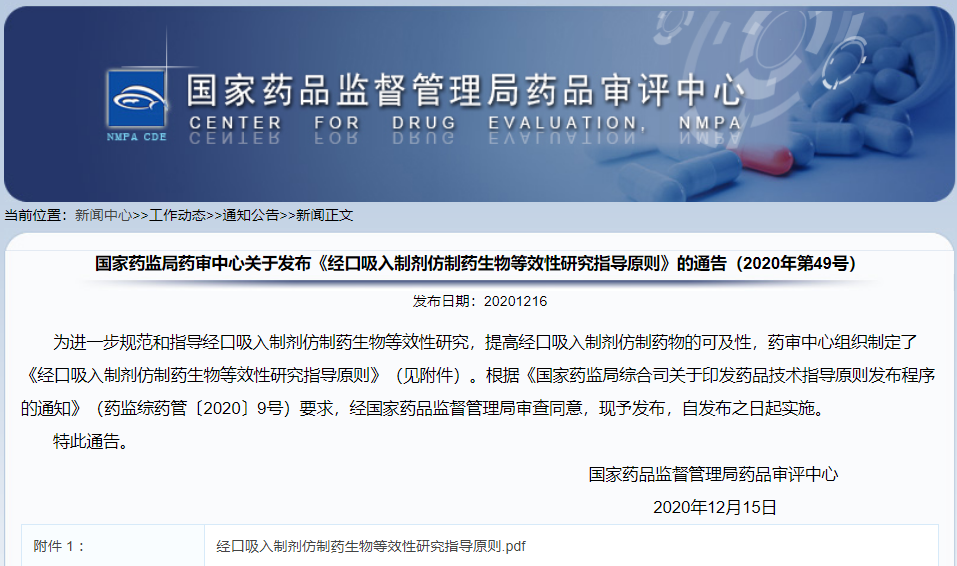 關(guān)于發(fā)布《經(jīng)口吸入制劑仿制藥生物等效性研究指導(dǎo)原則》的通告(2020年第49號(hào))