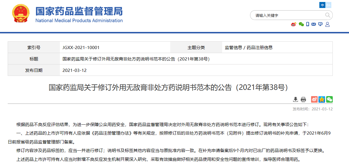 國(guó)家藥監(jiān)局關(guān)于修訂外用無敵膏非處方藥說明書范本的公告(2021年第38號(hào))