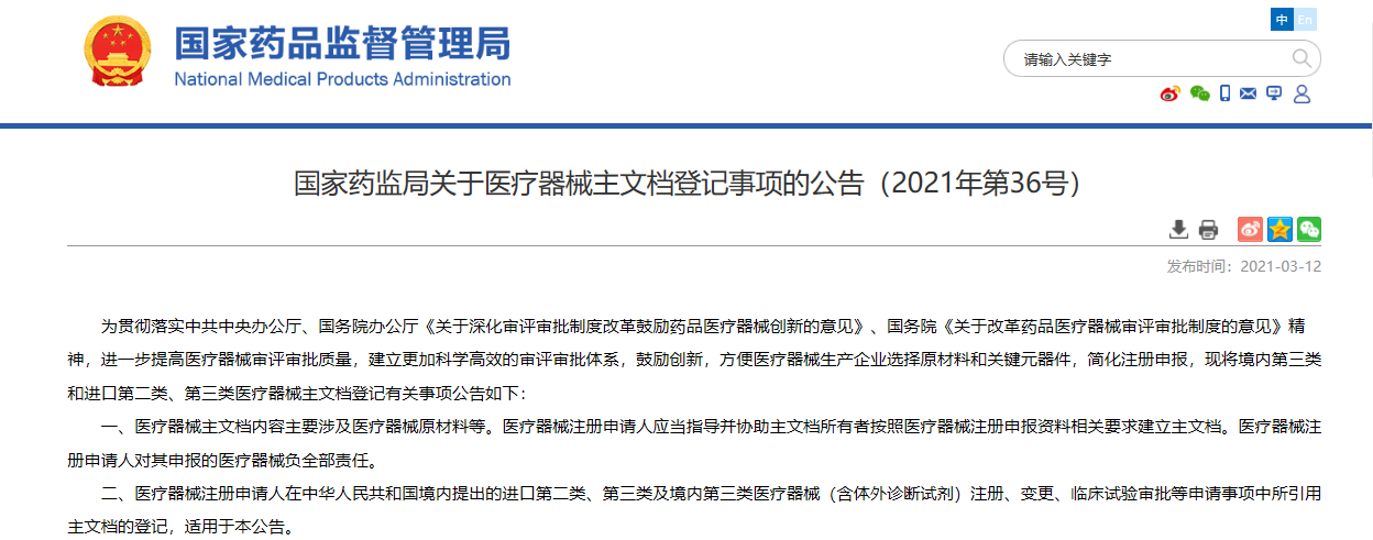 國(guó)家藥監(jiān)局關(guān)于醫(yī)療器械主文檔登記事項(xiàng)的公告(2021年第36號(hào))