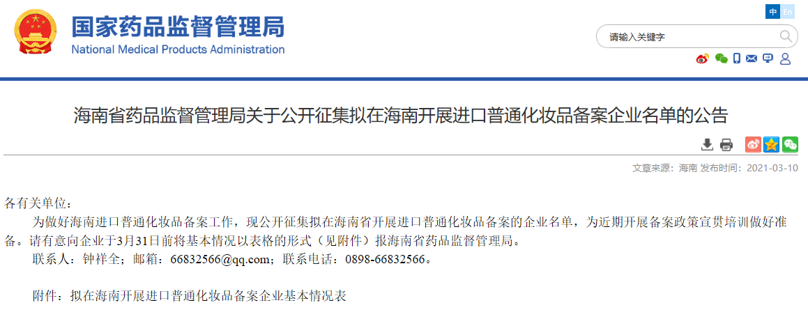 海南省藥品監(jiān)督管理局關(guān)于公開征集擬在海南開展進(jìn)口普通化妝品備案企業(yè)名單的公告