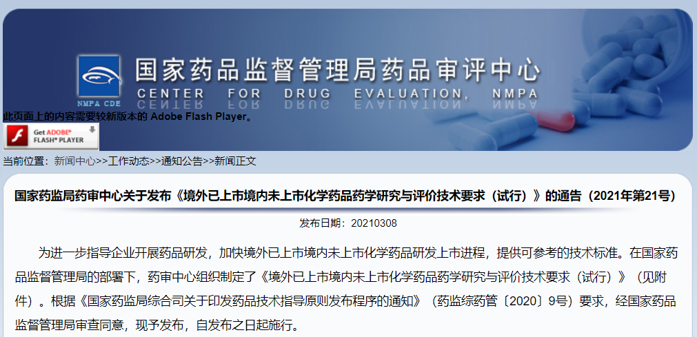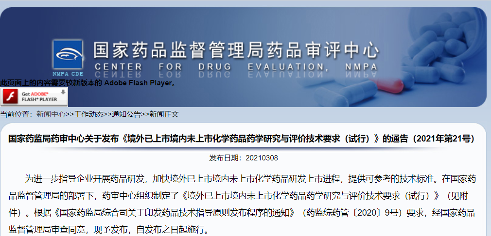 國(guó)家藥監(jiān)局藥審中心關(guān)于發(fā)布《境外已上市境內(nèi)未上市化學(xué)藥品藥學(xué)研究與評(píng)價(jià)技術(shù)要求(試行)》的通告(2021年第21號(hào))