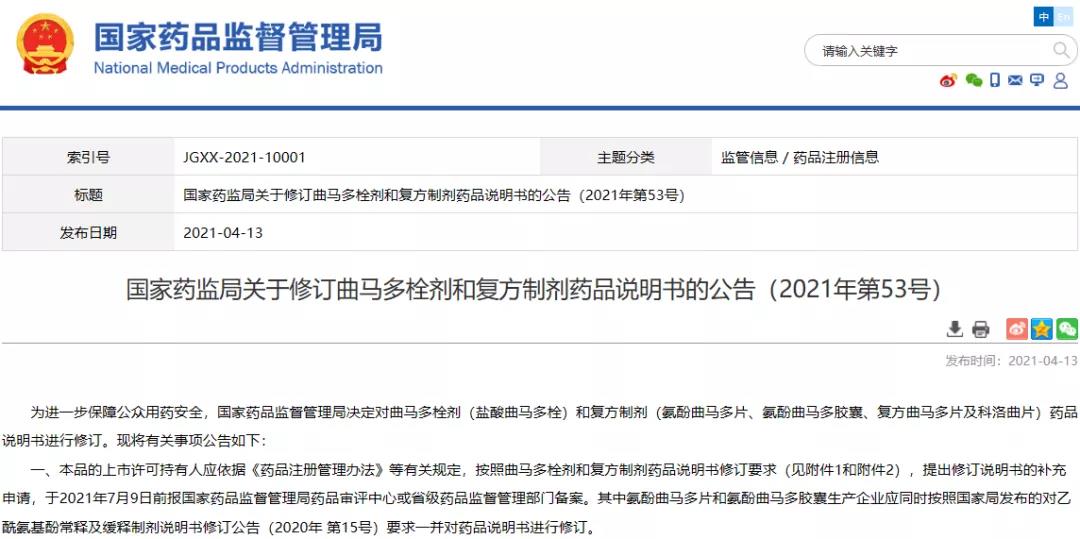 國(guó)家藥監(jiān)局關(guān)于修訂曲馬多栓劑和復(fù)方制劑藥品說明書的公告(2021年第53號(hào))