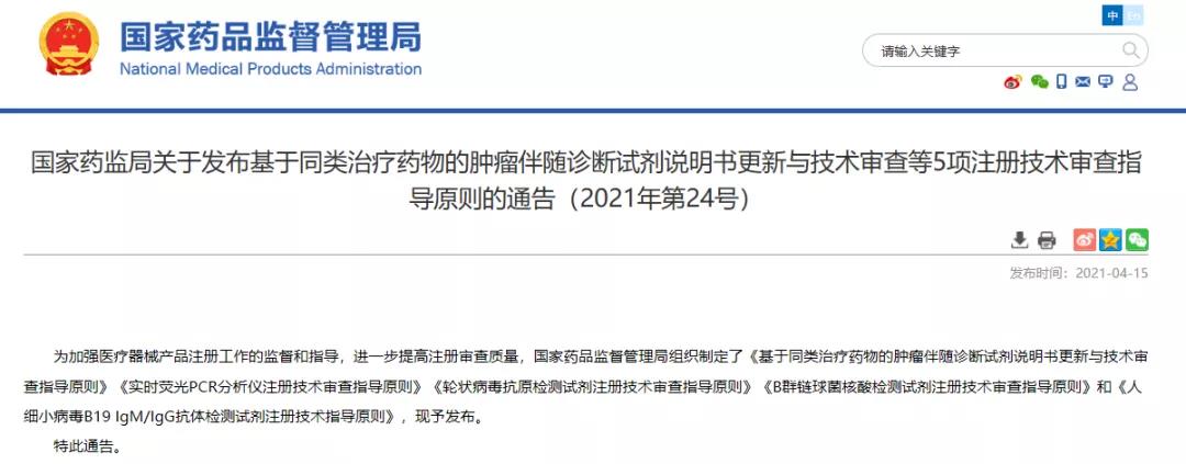 國(guó)家藥監(jiān)局關(guān)于發(fā)布基于同類治療藥物的腫瘤伴隨診斷試劑說明書更新與技術(shù)審查等5項(xiàng)注冊(cè)技術(shù)審查指導(dǎo)原則的通告(2021年第24號(hào))