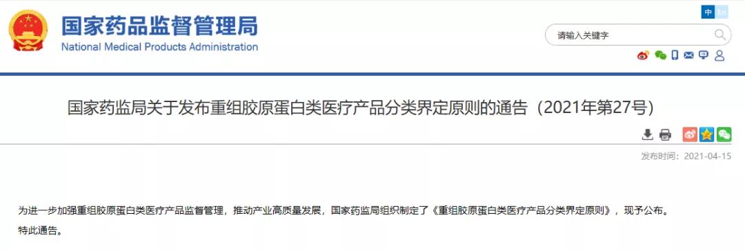 國(guó)家藥監(jiān)局關(guān)于發(fā)布重組膠原蛋白類醫(yī)療產(chǎn)品分類界定原則的通告(2021年第27號(hào))