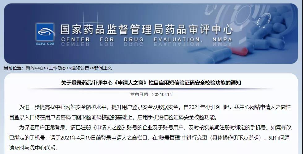 關(guān)于登錄藥品審評(píng)中心《申請(qǐng)人之窗》欄目啟用短信驗(yàn)證碼安全校驗(yàn)功能的通知