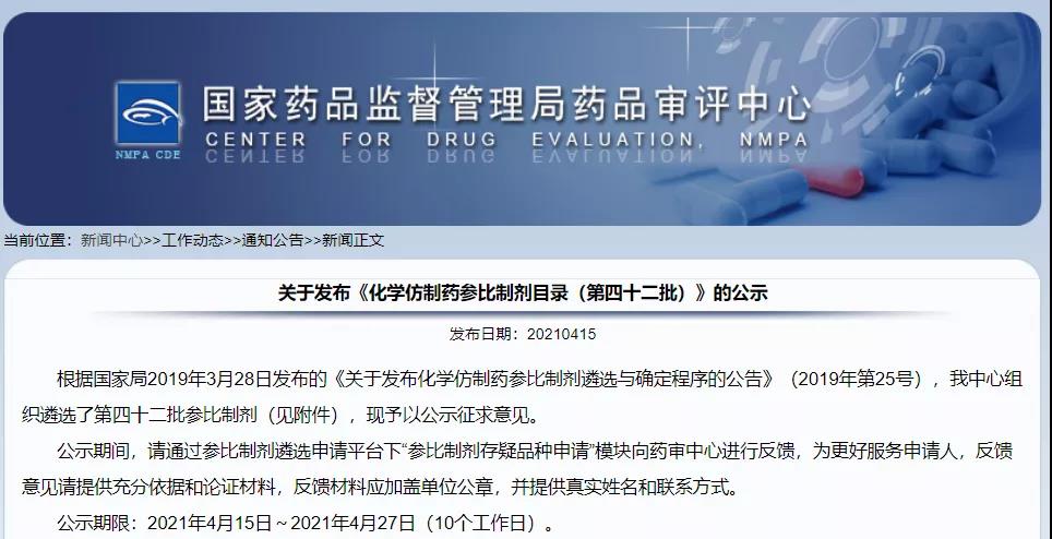 關(guān)于發(fā)布《化學(xué)仿制藥參比制劑目錄(第四十二批)》的公示