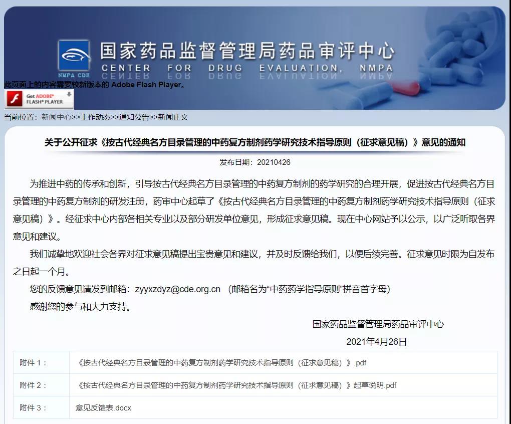 關(guān)于公開征求《按古代經(jīng)典名方目錄管理的中藥復方制劑藥學研究技術(shù)指導原則(征求意見稿)》意見的通知