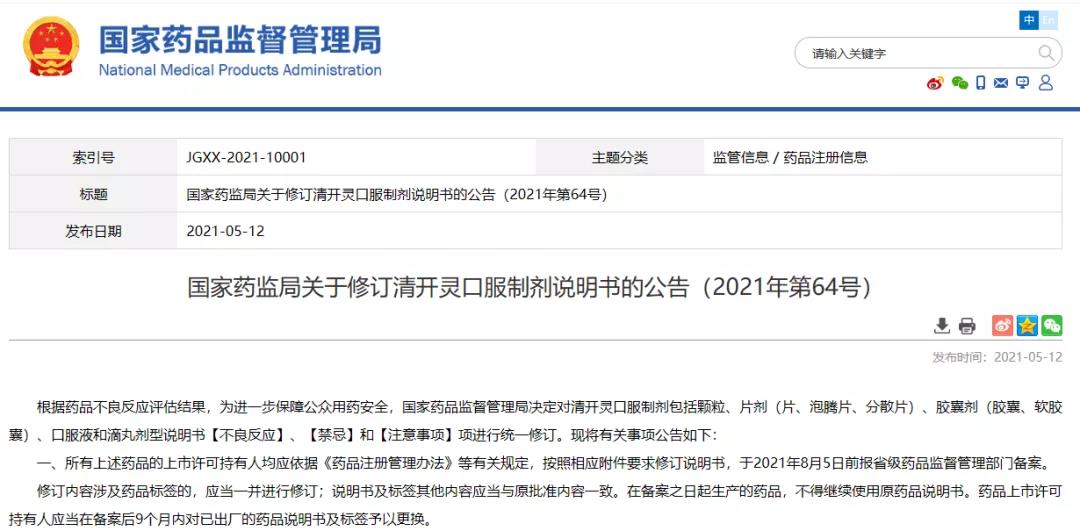 國家藥監(jiān)局關(guān)于修訂清開靈口服制劑說明書的公告(2021年第64號)