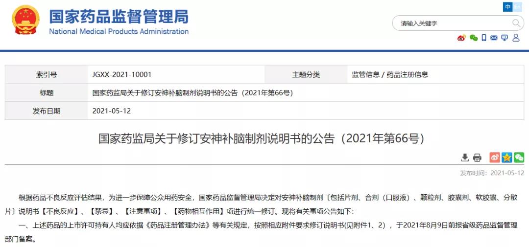 國家藥監(jiān)局關(guān)于修訂安神補腦制劑說明書的公告(2021年第66號)